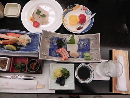 今晚最重要的行程,當然是看世界三大夜景之一的函館夜景。在出發前,當然要先祭祭自己的五臟廟。一走進餐廳,天啊!一個人桌上就有十幾個盤子,這頓懷石料理大餐,又要讓我的體重往上飆了。相機一個鏡頭還沒辦法照到全貌,可見有多豐盛!不過,我們也很納悶,為何日本人吃一頓飯要洗那麼多的餐具?我們的結論是:工作人員洗得很累,我們也吃得很累!